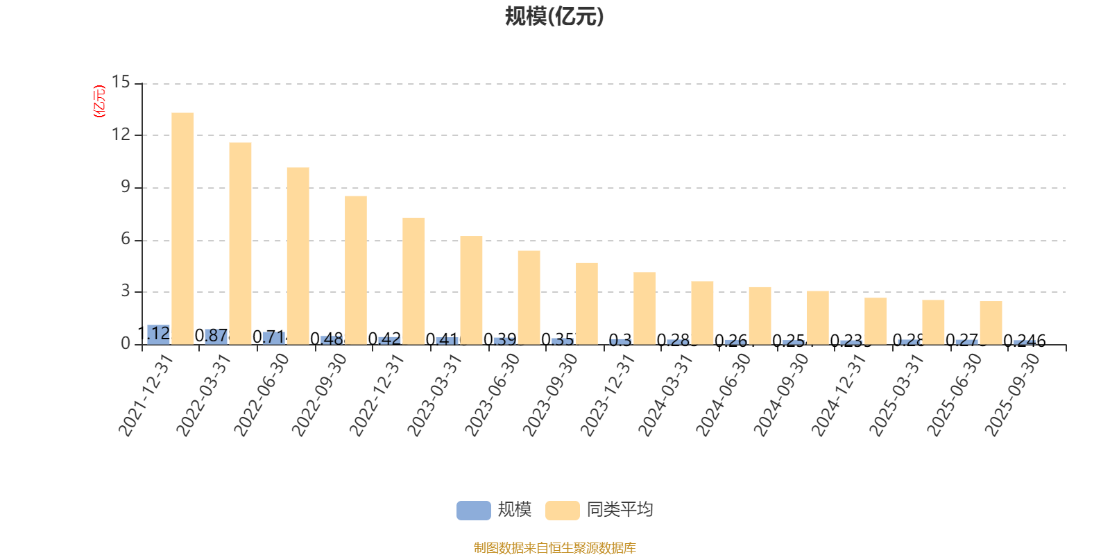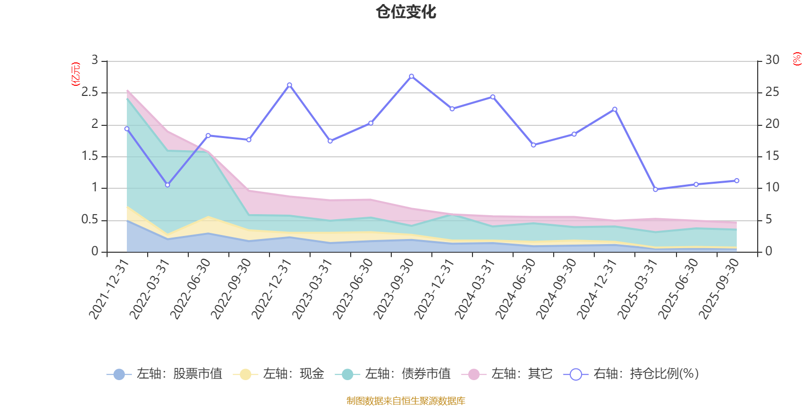 据定期报告数据统计,近三年平均股票仓位为18.97%,同类平均为19.14%。2023年三季度末基金达到27.59%的最高仓位,2025年一季度末最低,为9.82%。