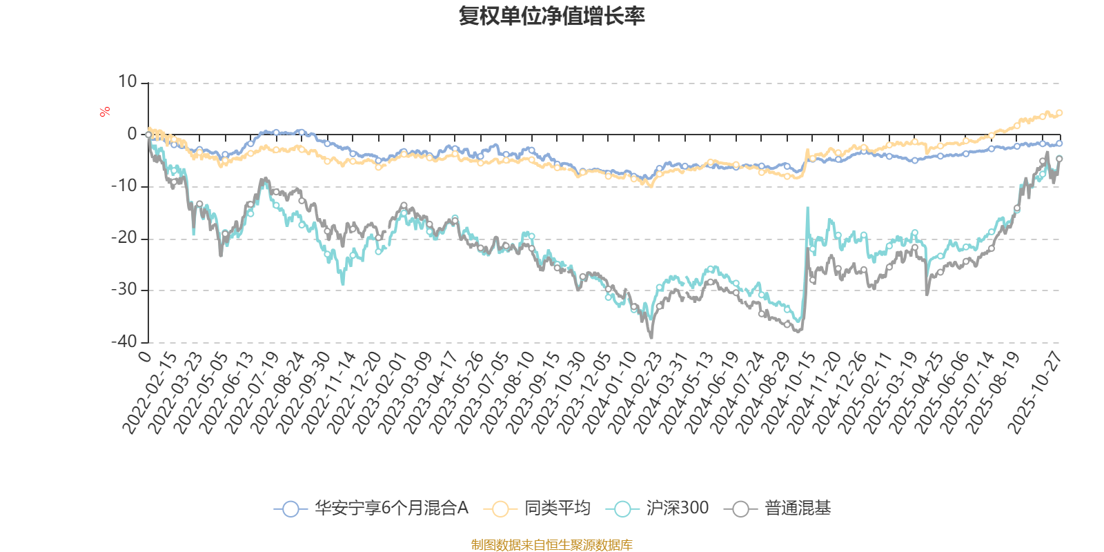 截至10月27日,华安宁享6个月混合A近三个月复权单位净值增长率为0.84%,位于同类可比基金520/629;近半年复权单位净值增长率为2.57%,位于同类可比基金535/629;近一年复权单位净值增长率为3.29%,位于同类可比基金560/623;近三年复权单位净值增长率为0.83%,位于同类可比基金517/557。