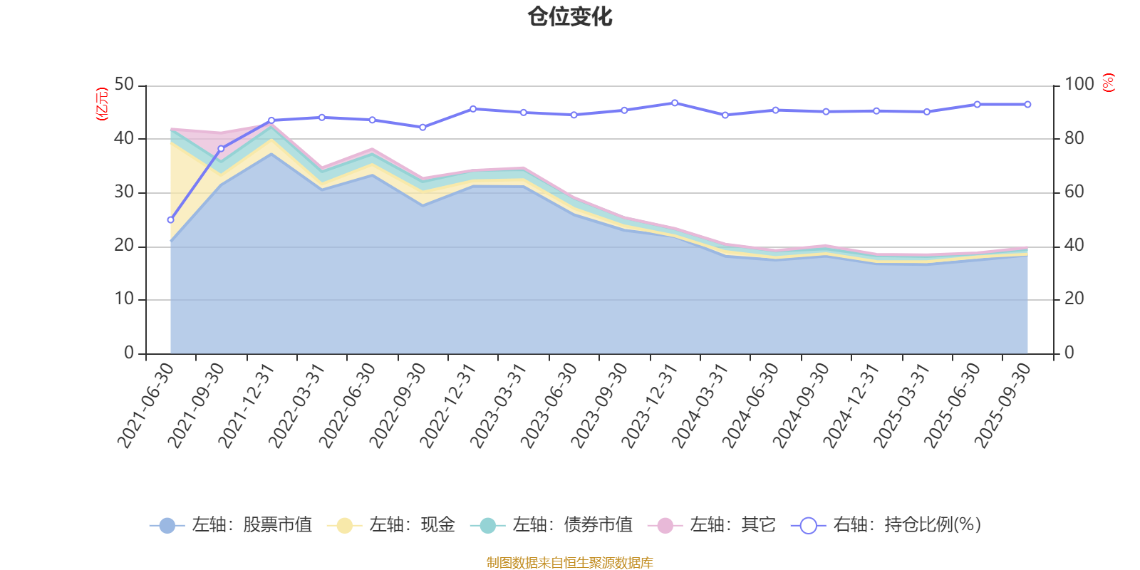 据定期报告数据统计,近三年平均股票仓位为90.93%,同类平均为87.62%。2023年末基金达到93.53%的最高仓位,2021年上半年末最低,为49.92%。