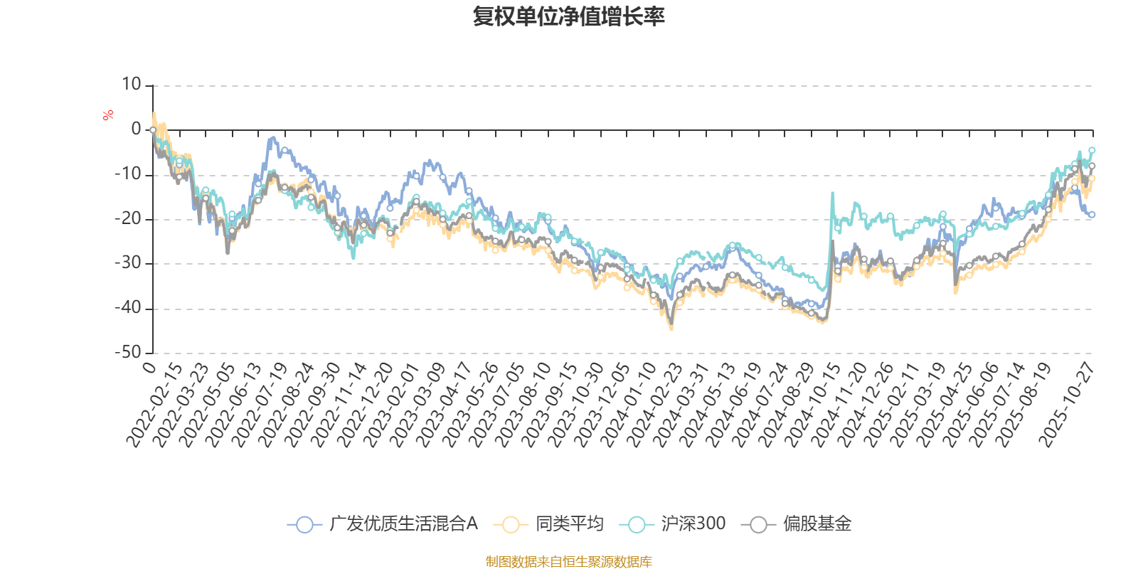 截至10月27日,广发优质生活混合A近三个月复权单位净值增长率为-1.25%,位于同类可比基金263/265;近半年复权单位净值增长率为4.05%,位于同类可比基金264/265;近一年复权单位净值增长率为11.92%,位于同类可比基金234/265;近三年复权单位净值增长率为5.69%,位于同类可比基金178/253。
