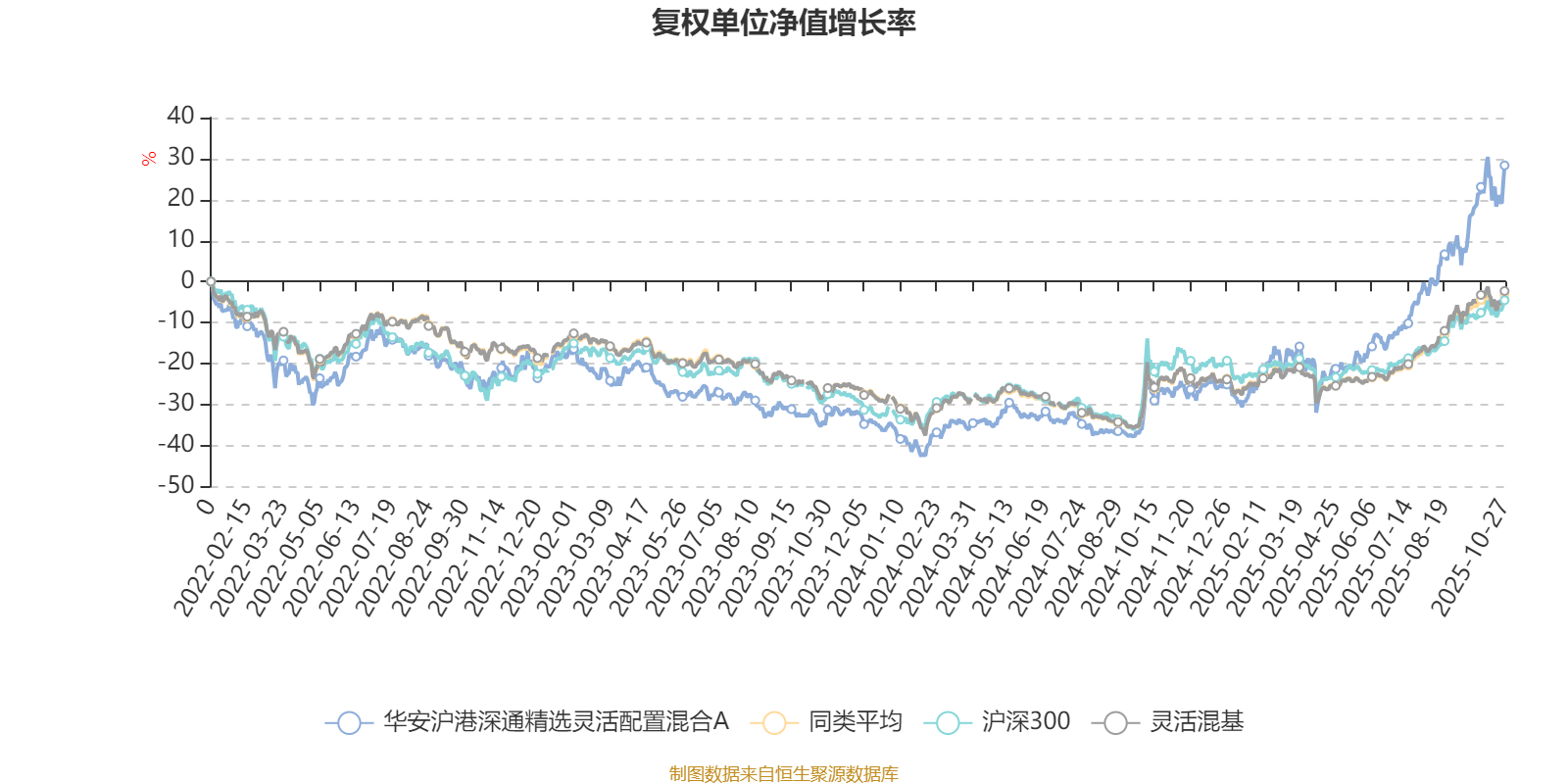 截至10月27日,华安沪港深通精选灵活配置混合A近三个月复权单位净值增长率为32.22%,位于同类可比基金163/1287;近半年复权单位净值增长率为63.02%,位于同类可比基金90/1287;近一年复权单位净值增长率为74.76%,位于同类可比基金48/1287;近三年复权单位净值增长率为70.32%,位于同类可比基金61/1286。