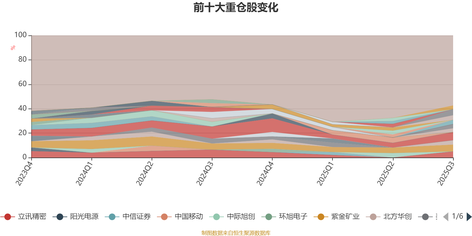 截至2025年三季度末,基金十大重仓股分别是宁德时代、紫金矿业、立讯精密、工业富联、亿纬锂能、北方华创、恒瑞医药、药明康德、寒武纪、兆易创新。