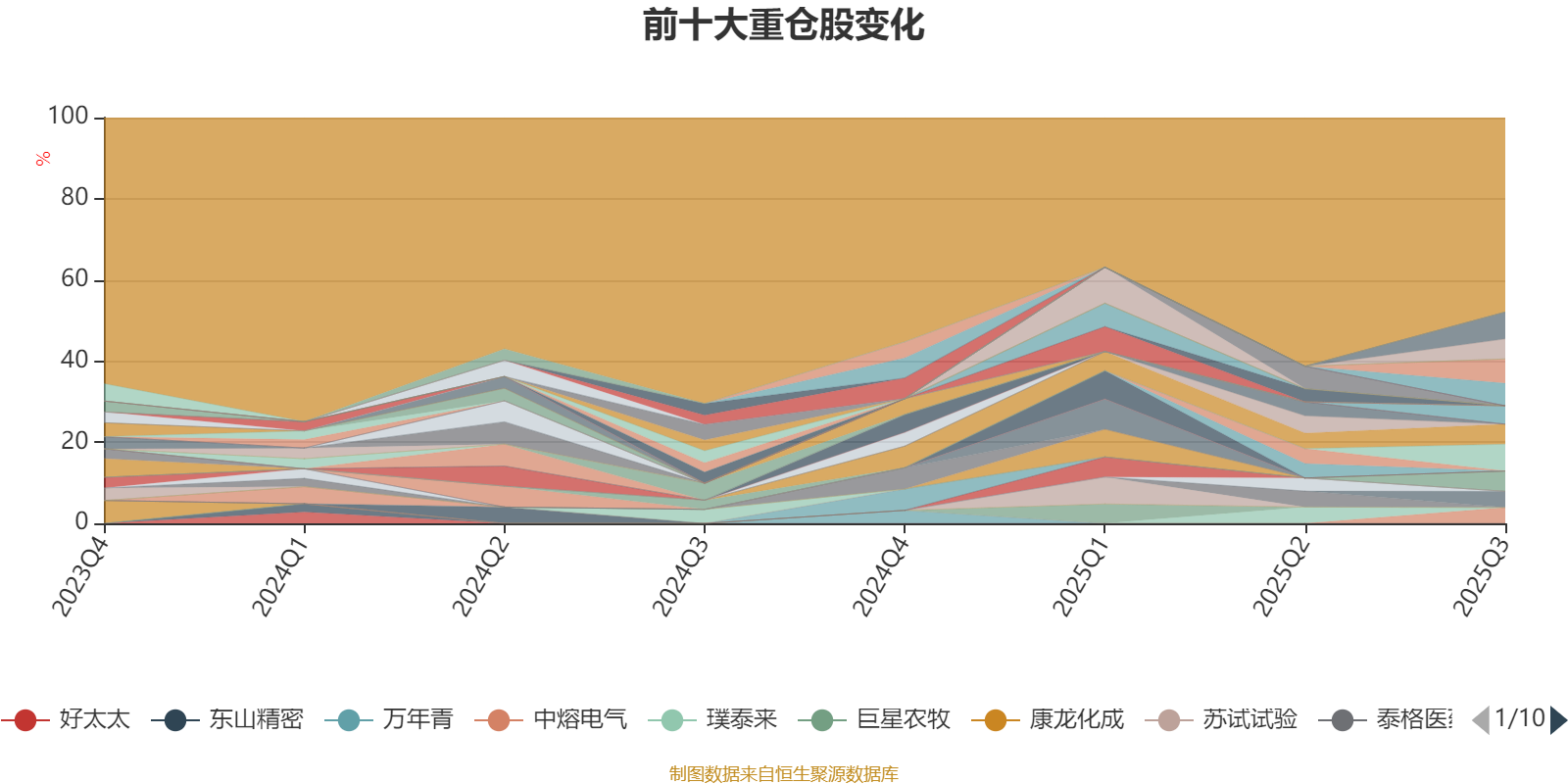 截至2025年三季度末,基金十大重仓股分别是恩捷股份、天顺风能、亿纬锂能、金雷股份、中航沈飞、鼎龙股份、壹网壹创、紫光国微、珠海冠宇、中熔电气。