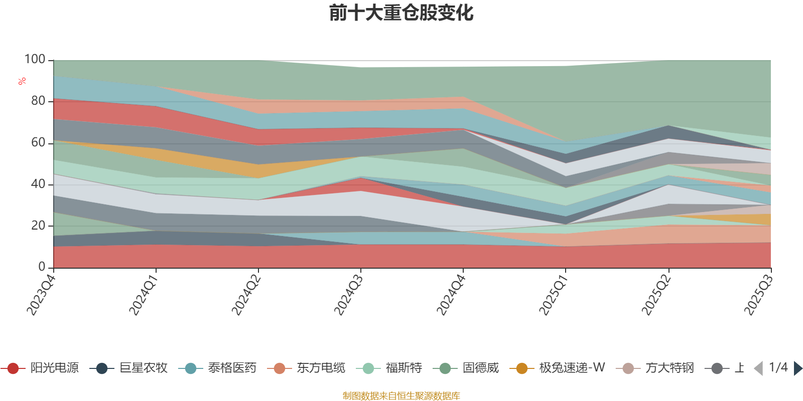 该基金持股集中度较高,近2年前十大重仓股集中度长期超过60%。截至2025年三季度末,基金十大重仓股分别是阳光电源、东方电缆、中天科技、福莱特玻璃、华菱钢铁、圆通速递、极兔速递-W、晶澳科技、方大特钢、燕京啤酒。