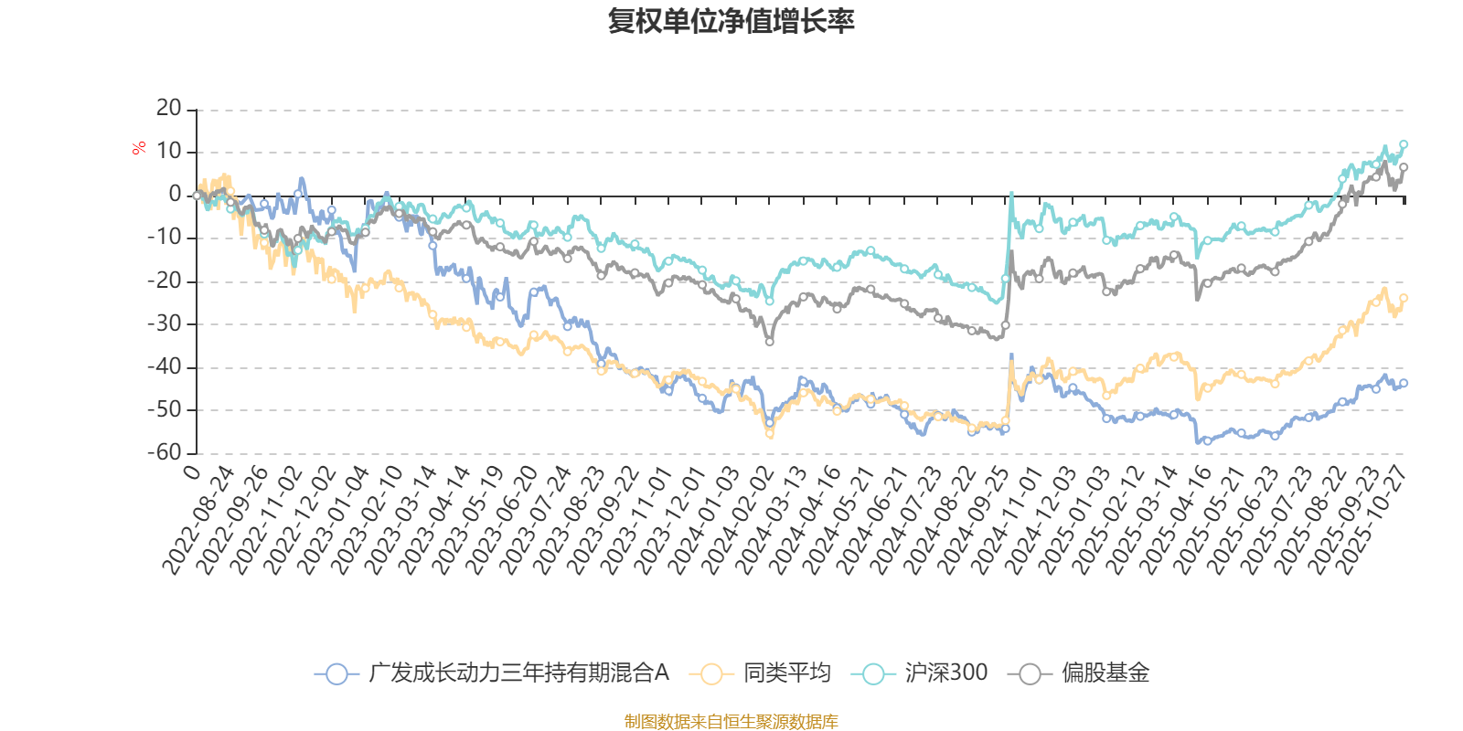 截至10月27日,广发成长动力三年持有期混合A近三个月复权单位净值增长率为15.03%,位于同类可比基金70/100;近半年复权单位净值增长率为28.17%,位于同类可比基金62/99;近一年复权单位净值增长率为-6.42%,位于同类可比基金87/90;近三年复权单位净值增长率为-42.98%,位于同类可比基金58/62。