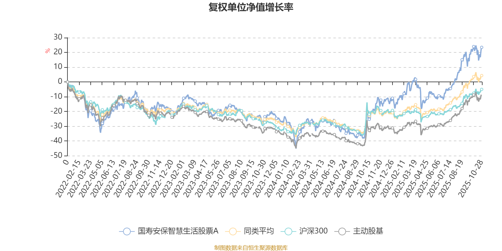 截至10月28日,国寿安保智慧生活股票A近三个月复权单位净值增长率为21.68%,位于同类可比基金18/58;近半年复权单位净值增长率为39.28%,位于同类可比基金15/57;近一年复权单位净值增长率为50.91%,位于同类可比基金8/57;近三年复权单位净值增长率为56.46%,位于同类可比基金15/56。
