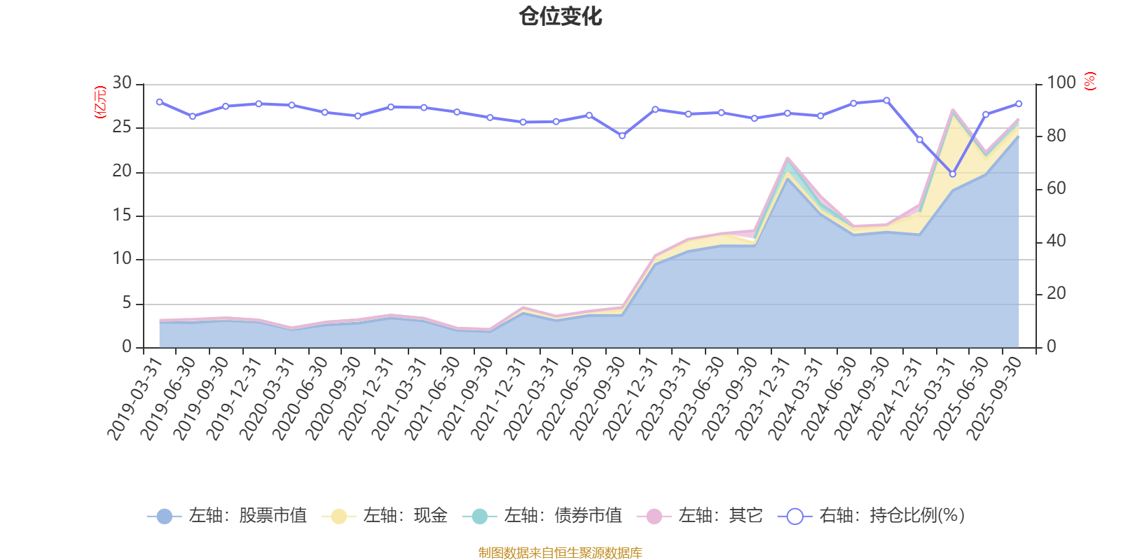 据定期报告数据统计,近三年平均股票仓位为87.01%,同类平均为88.58%。2024年三季度末基金达到93.79%的最高仓位,2025年一季度末最低,为65.84%。