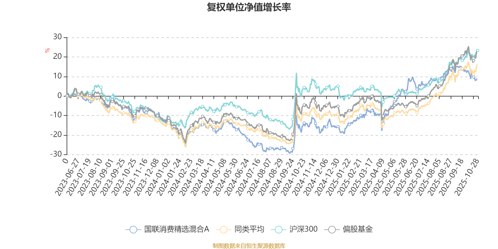 截至10月27日,国联消费精选混合A近三个月复权单位净值增长率为1.11%,位于同类可比基金650/689;近半年复权单位净值增长率为15.24%,位于同类可比基金565/688;近一年复权单位净值增长率为27.05%,位于同类可比基金330/653。