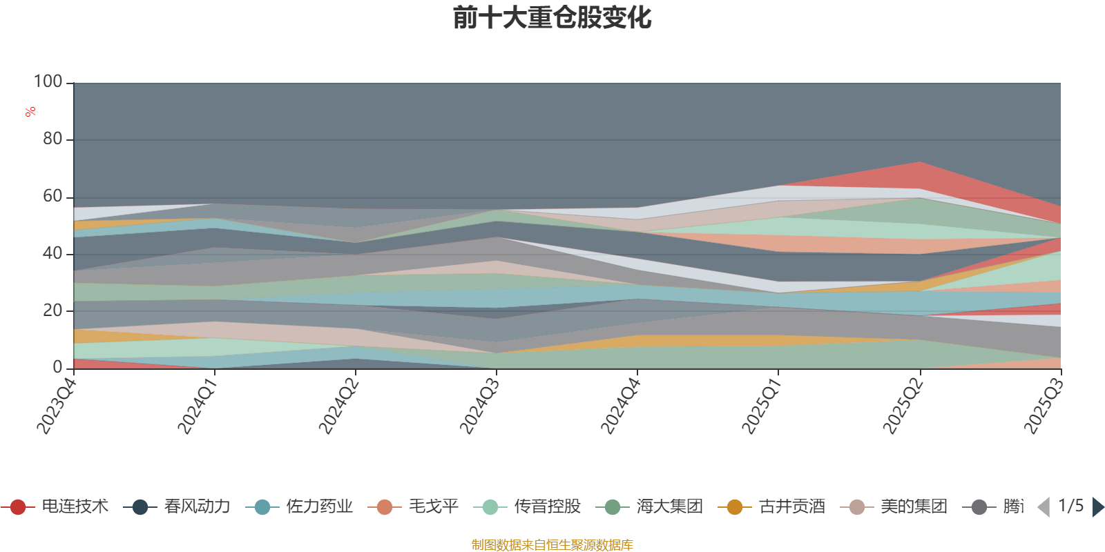 该基金持股集中度较高。截至2025年三季度末,基金十大重仓股分别是腾讯控股、农夫山泉、网易云音乐、科达制造、中国生物制药、ST华通、潮宏基、泽璟制药、隆鑫通用、毛戈平。