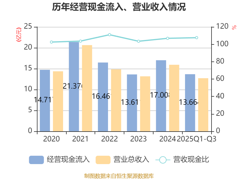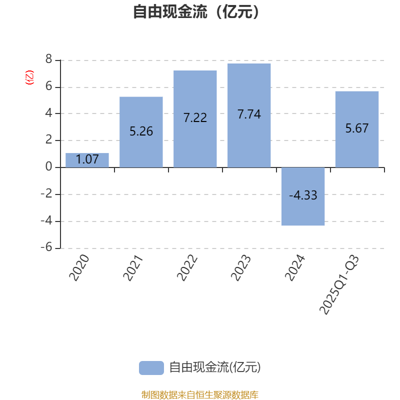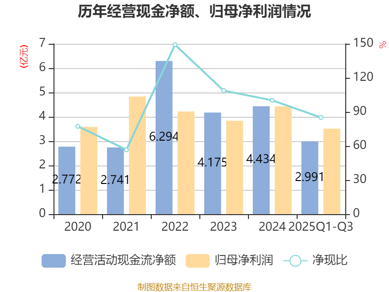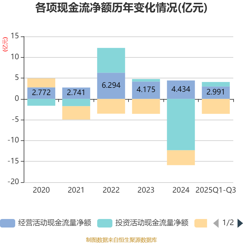 2025年前三季度,公司经营活动现金流净额为2.99亿元,同比增长16.51%;筹资活动现金流净额-3.58亿元,与同期相比基本不变;投资活动现金流净额1.08亿元,上年同期为-10.44亿元。
