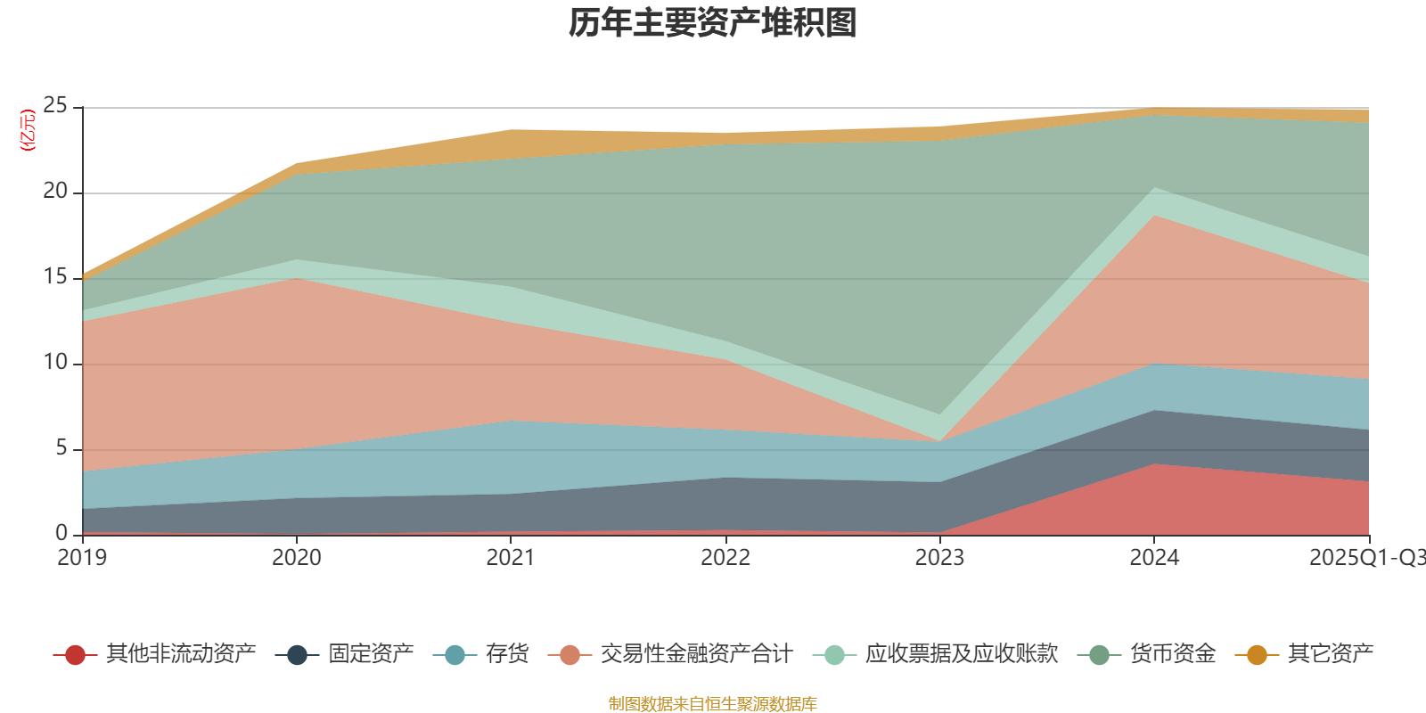 资产重大变化方面,截至2025年三季度末,公司货币资金较上年末增加84.73%,占公司总资产比重上升14.53个百分点;交易性金融资产合计较上年末减少35.31%,占公司总资产比重下降12.1个百分点;其他非流动资产较上年末减少24.73%,占公司总资产比重下降4.02个百分点;预付款项较上年末增加267.79%,占公司总资产比重上升1.16个百分点。