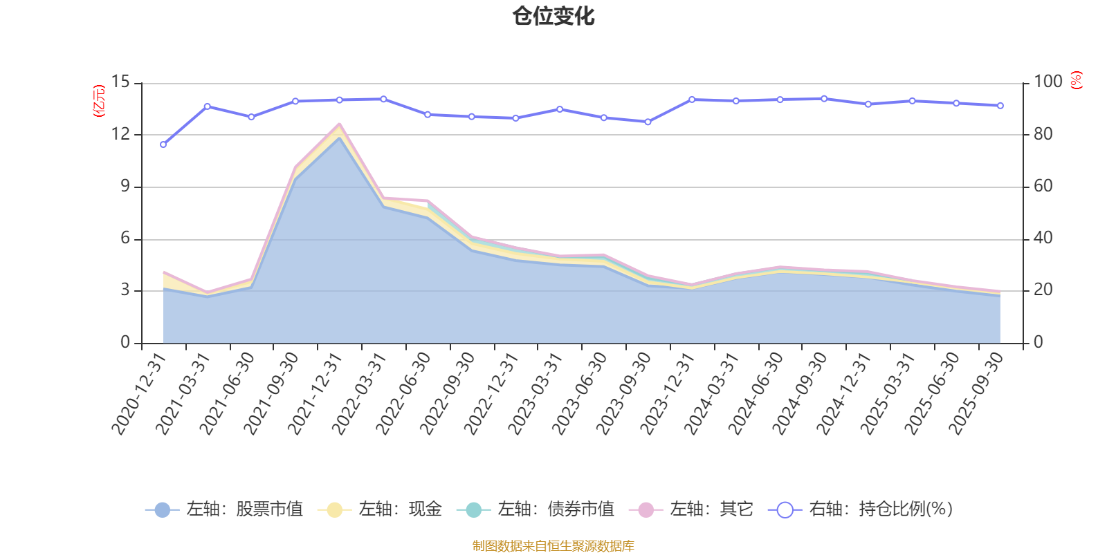据定期报告数据统计,近三年平均股票仓位为90.9%,同类平均为86.77%。2024年三季度末基金达到93.97%的最高仓位,2020年末最低,为76.35%。