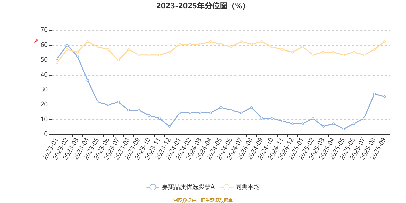 通过所选区间该基金净值增长率分位图,可以观察该基金与同类基金业绩比较情况。图为坐标原点到区间内某时点的净值增长率在同类基金中的分位数。