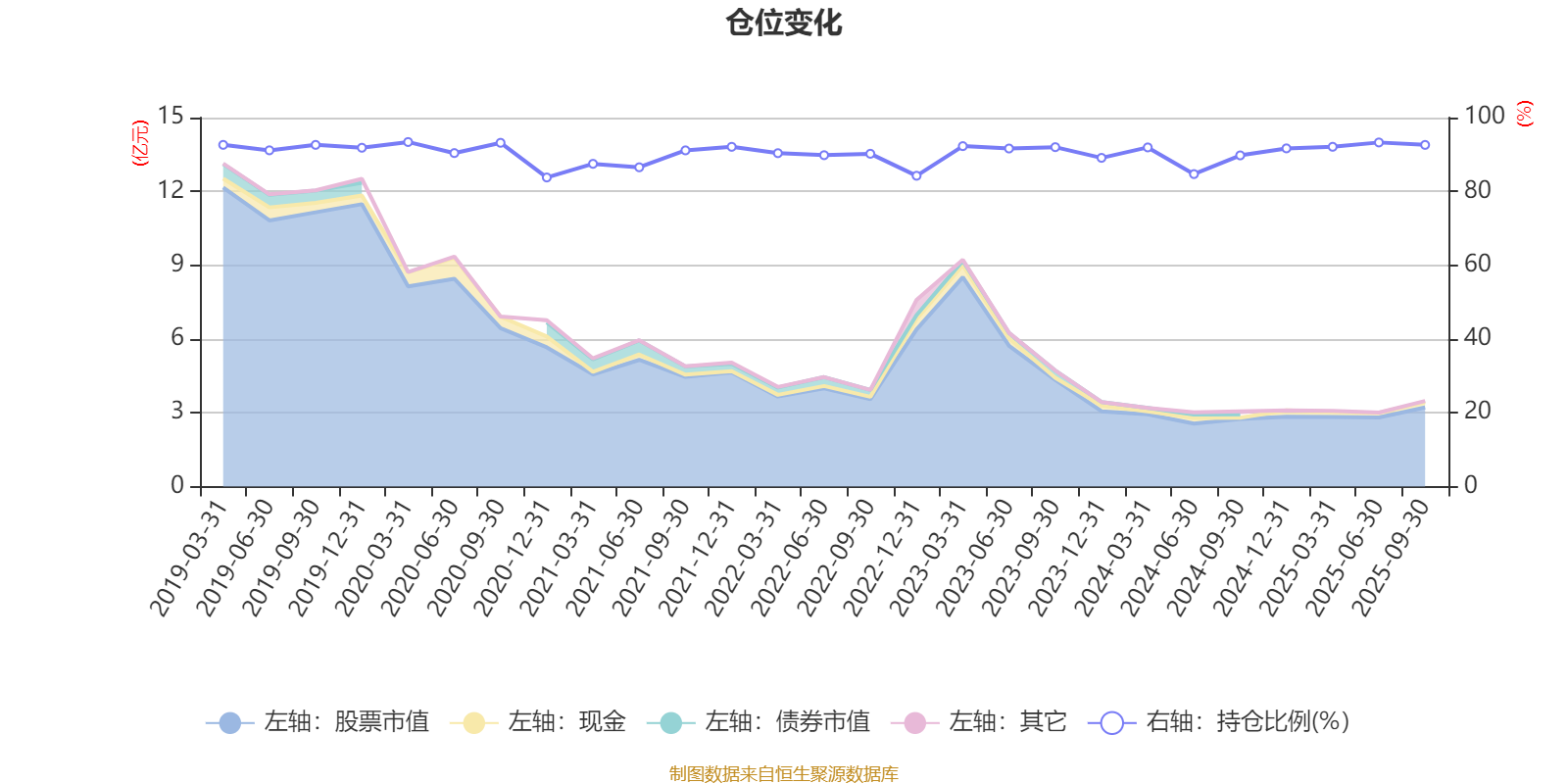据定期报告数据统计,近三年平均股票仓位为90.43%,同类平均为88.27%。2020年一季度末基金达到93.38%的最高仓位,2020年末最低,为83.77%。