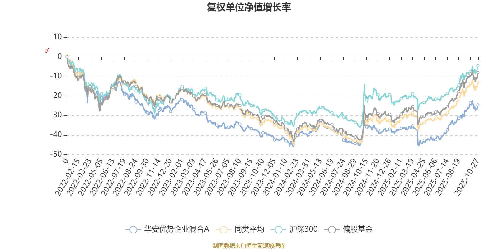 截至10月27日,华安优势企业混合A近三个月复权单位净值增长率为14.17%,位于同类可比基金104/185;近半年复权单位净值增长率为31.45%,位于同类可比基金84/185;近一年复权单位净值增长率为17.49%,位于同类可比基金141/181;近三年复权单位净值增长率为7.94%,位于同类可比基金129/175。