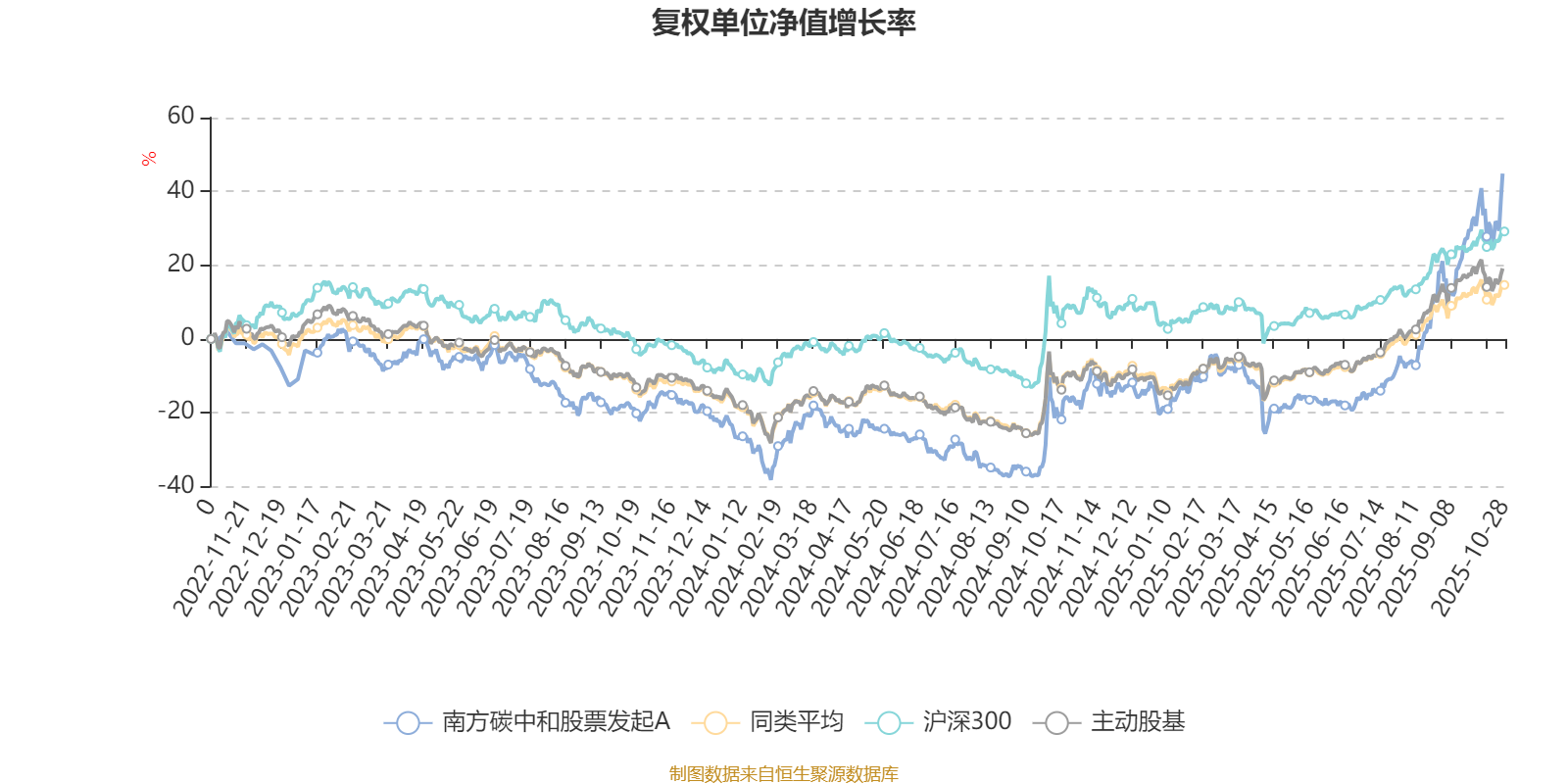 截至10月27日,南方碳中和股票发起A近三个月复权单位净值增长率为57.66%,位于同类可比基金1/121;近半年复权单位净值增长率为77.66%,位于同类可比基金1/121;近一年复权单位净值增长率为71.60%,位于同类可比基金3/115;近三年复权单位净值增长率为44.81%,位于同类可比基金19/87。