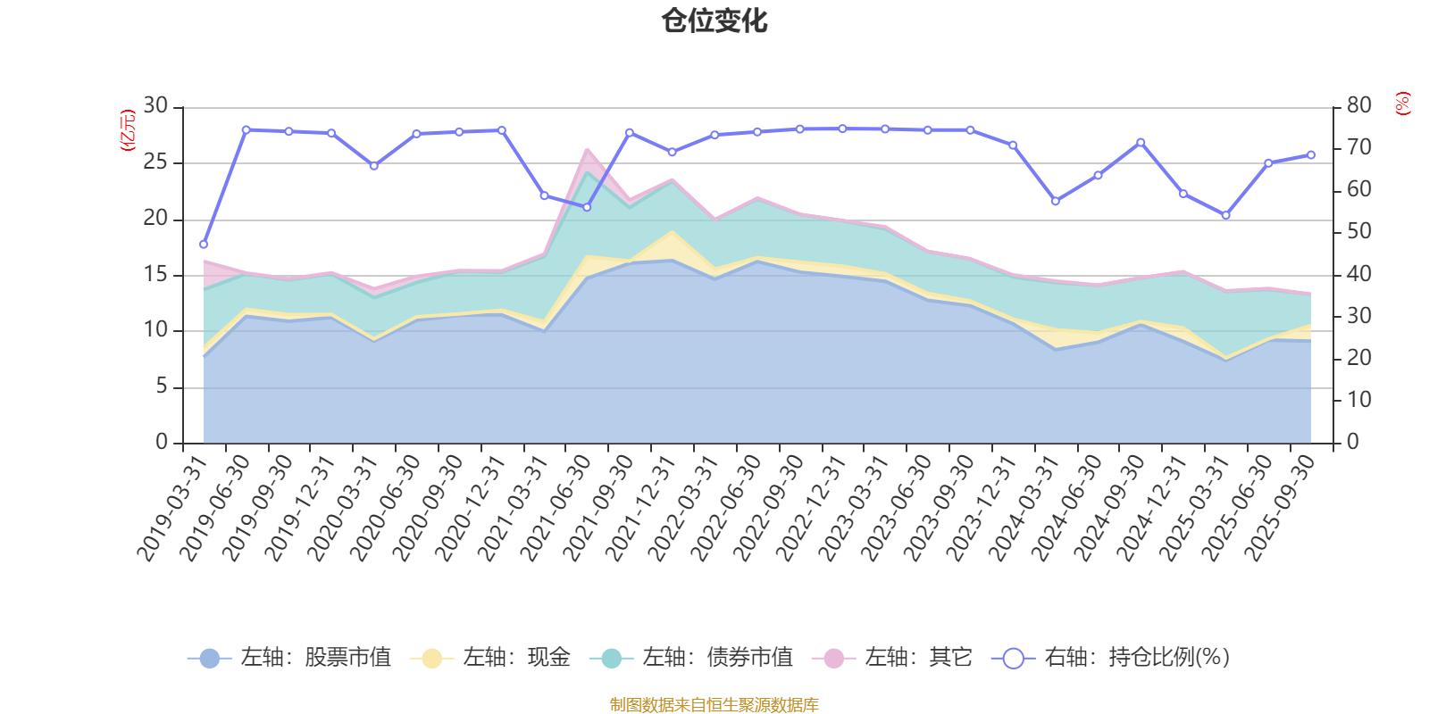 据定期报告数据统计,近三年平均股票仓位为67.63%,同类平均为72.35%。2022年末基金达到74.88%的最高仓位,2019年一季度末最低,为47.35%。