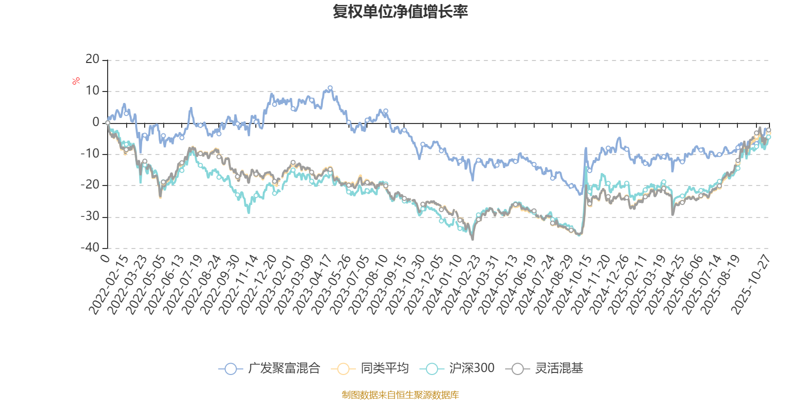截至10月27日,广发聚富混合近三个月复权单位净值增长率为5.00%,位于同类可比基金942/1287;近半年复权单位净值增长率为10.62%,位于同类可比基金1016/1287;近一年复权单位净值增长率为10.46%,位于同类可比基金945/1287;近三年复权单位净值增长率为-1.70%,位于同类可比基金1024/1286。