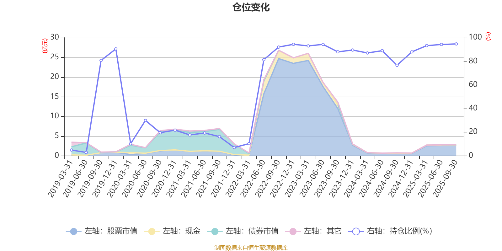据定期报告数据统计,近三年平均股票仓位为90.15%,同类平均为72.35%。2025年三季度末基金达到94.67%的最高仓位,2019年上半年末最低,为2.82%。