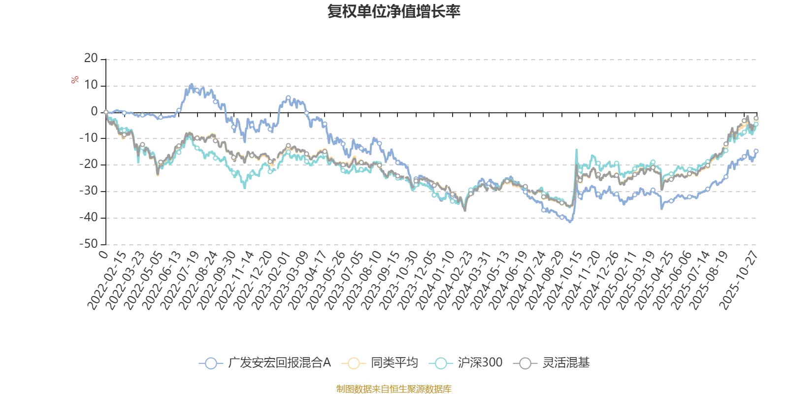 截至10月27日,广发安宏回报混合A近三个月复权单位净值增长率为16.09%,位于同类可比基金501/1287;近半年复权单位净值增长率为28.27%,位于同类可比基金524/1287;近一年复权单位净值增长率为19.20%,位于同类可比基金718/1287;近三年复权单位净值增长率为-7.13%,位于同类可比基金1099/1286。