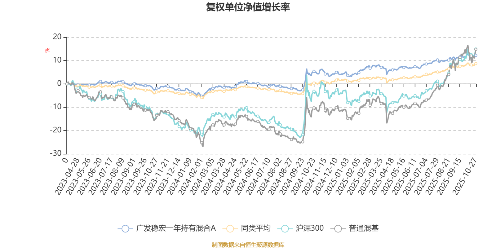 截至10月27日,广发稳宏一年持有混合A近三个月复权单位净值增长率为2.08%,位于同类可比基金359/629;近半年复权单位净值增长率为5.71%,位于同类可比基金299/629;近一年复权单位净值增长率为6.87%,位于同类可比基金329/623。