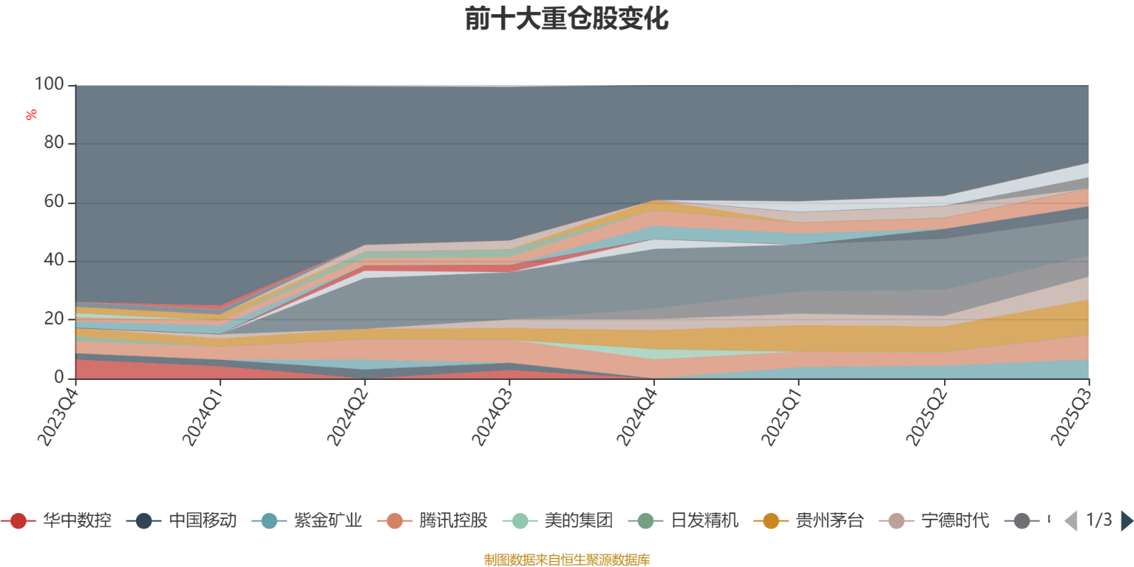 截至2025年三季度末,基金十大重仓股分别是中航西飞、贵州茅台、腾讯控股、宁德时代、中航高科、紫金矿业、中芯国际、华润置地、恒瑞医药、隆基绿能。
