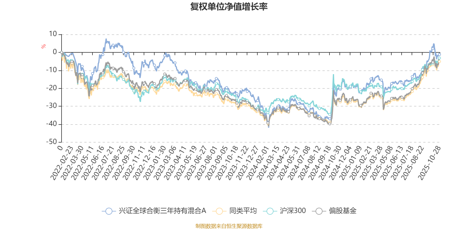 截至10月28日,兴证全球合衡三年持有混合A近三个月复权单位净值增长率为12.29%,位于同类可比基金79/130;近半年复权单位净值增长率为23.17%,位于同类可比基金81/130;近一年复权单位净值增长率为22.18%,位于同类可比基金78/130;近三年复权单位净值增长率为15.21%,位于同类可比基金86/124。