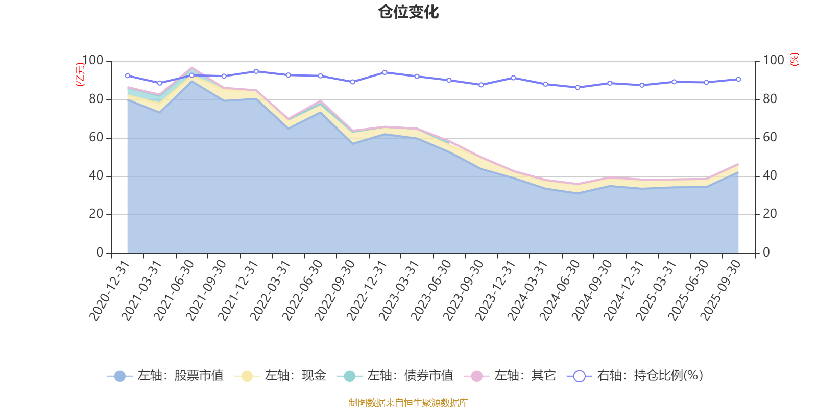 据定期报告数据统计,近三年平均股票仓位为89.57%,同类平均为86.15%。2021年末基金达到94.7%的最高仓位,2024年上半年末最低,为86.35%。