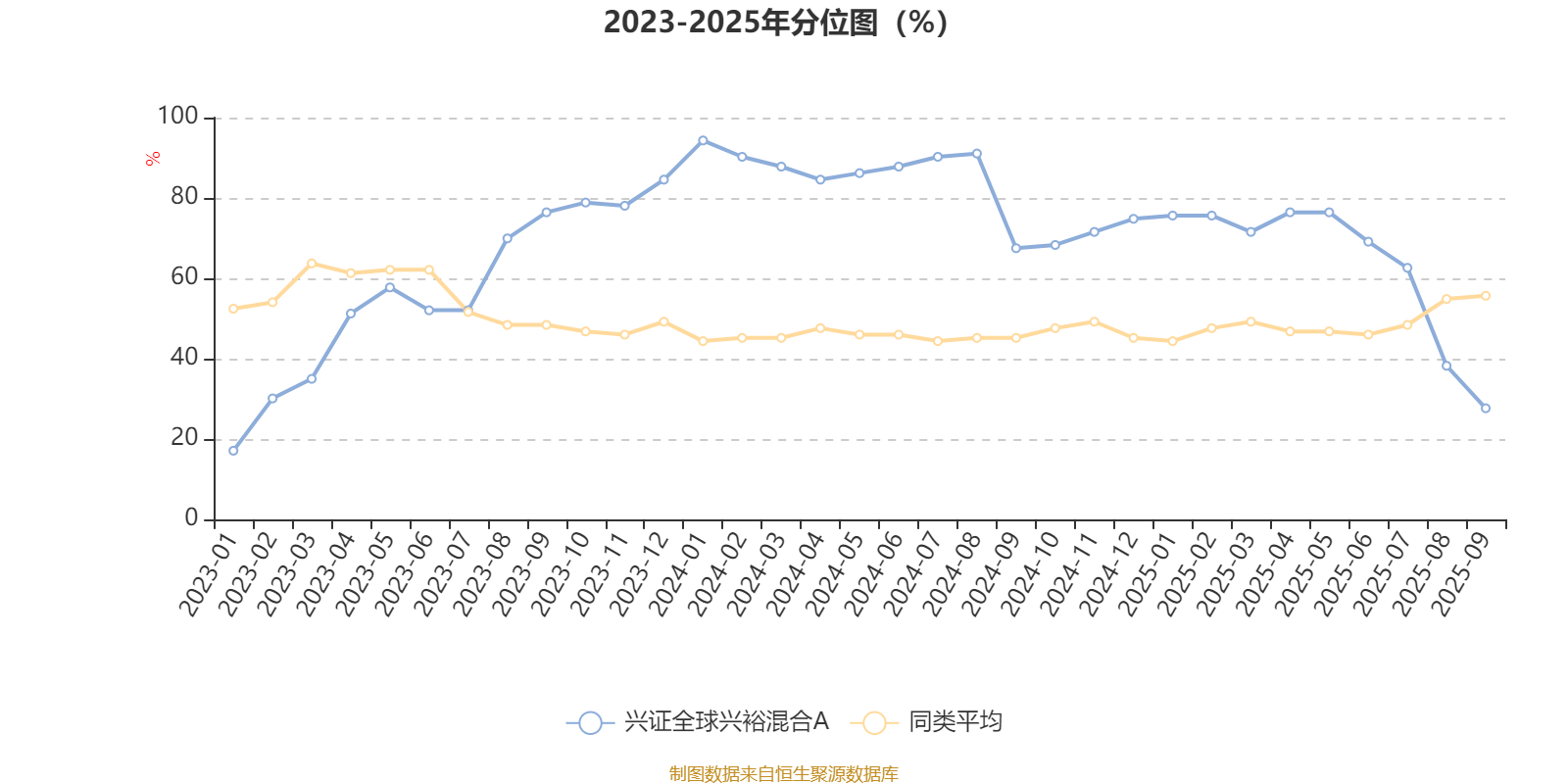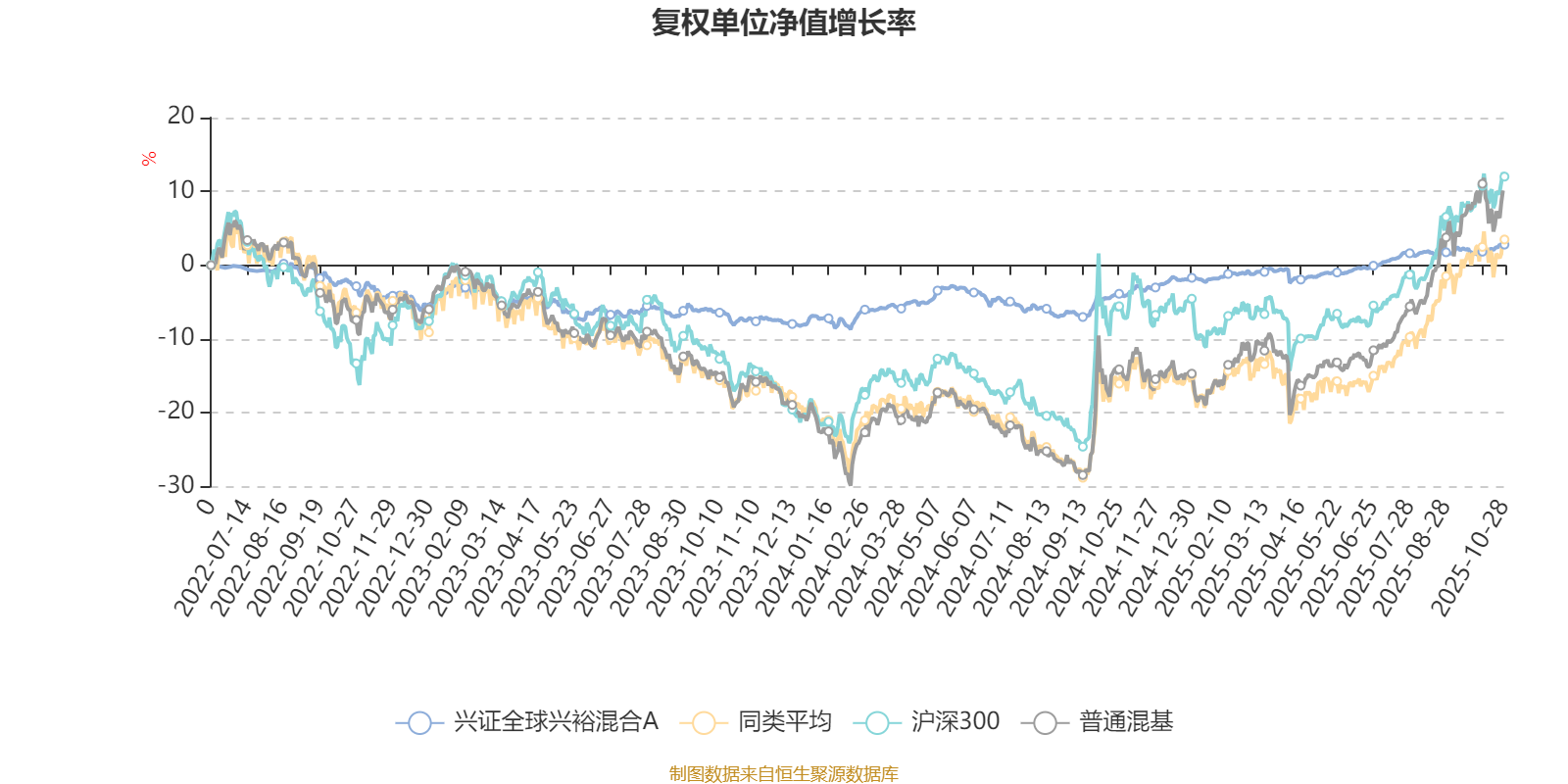截至10月28日,兴证全球兴裕混合A近三个月复权单位净值增长率为1.15%,位于同类可比基金128/134;近半年复权单位净值增长率为4.48%,位于同类可比基金126/134;近一年复权单位净值增长率为6.75%,位于同类可比基金112/130;近三年复权单位净值增长率为6.40%,位于同类可比基金92/119。