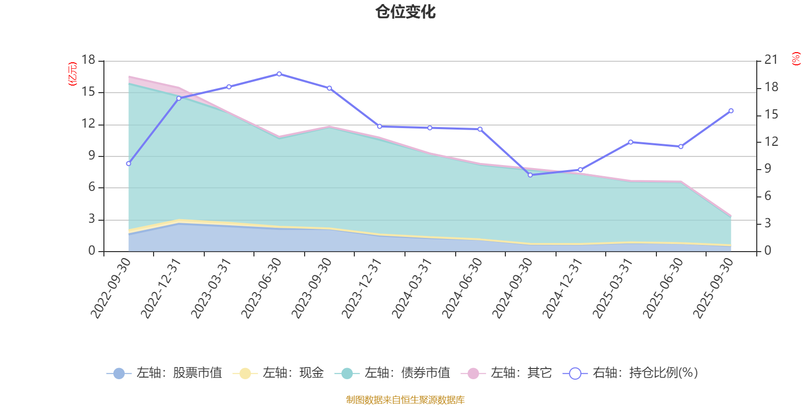 据定期报告数据统计,近三年平均股票仓位为14.15%,同类平均为67.37%。2023年上半年末基金达到19.55%的最高仓位,2024年三季度末最低,为8.41%。