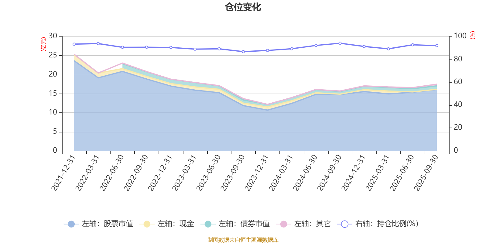 据定期报告数据统计,近三年平均股票仓位为90.29%,同类平均为87.62%。2024年三季度末基金达到94.09%的最高仓位,2023年三季度末最低,为86.7%。