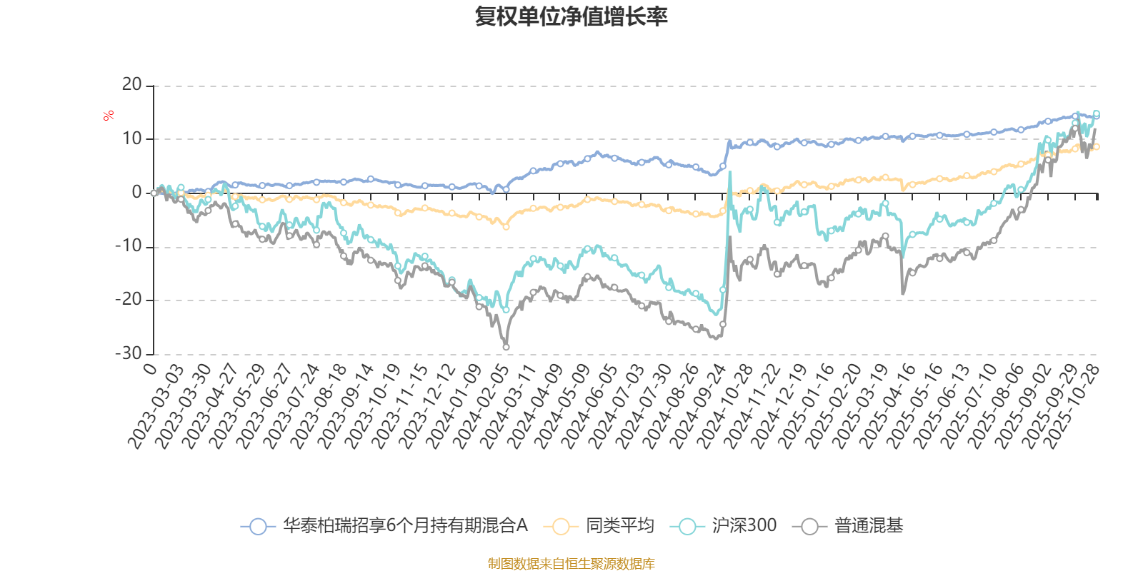 截至10月28日,华泰柏瑞招享6个月持有期混合A近三个月复权单位净值增长率为2.13%,位于同类可比基金334/629;近半年复权单位净值增长率为3.46%,位于同类可比基金468/629;近一年复权单位净值增长率为4.50%,位于同类可比基金486/623。