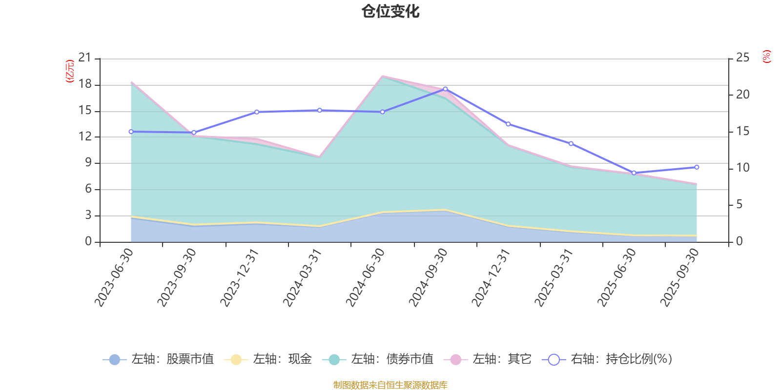 据定期报告数据统计,成立以来平均股票仓位为15.33%,同类平均为19.14%。2024年三季度末基金达到20.85%的最高仓位,2025年上半年末最低,为9.42%。