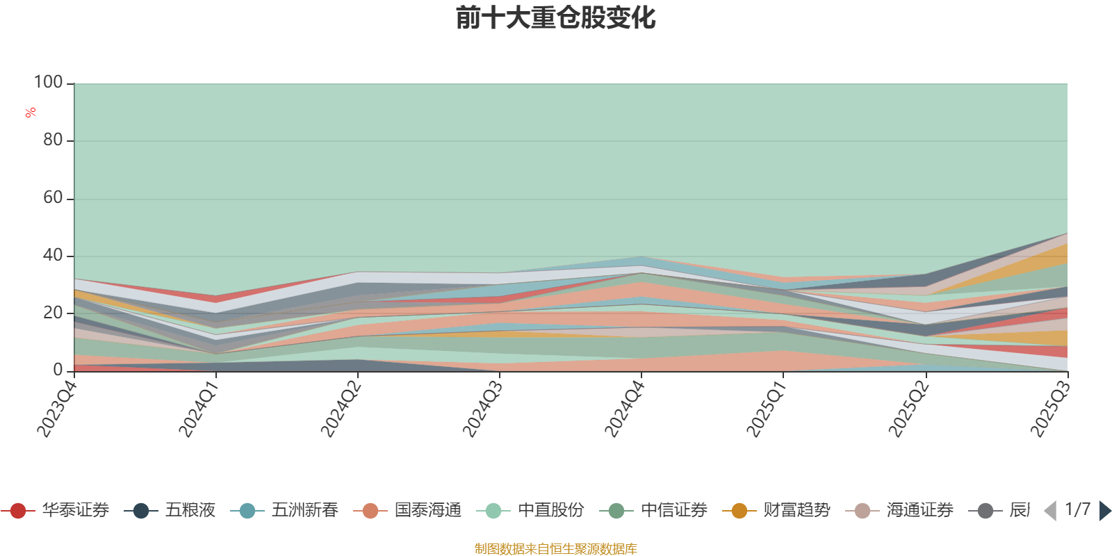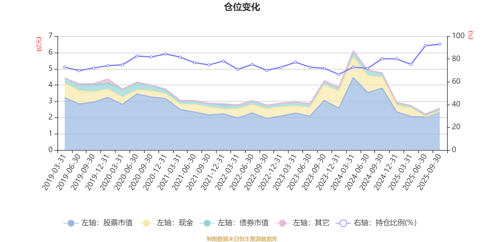 据定期报告数据统计,近三年平均股票仓位为77.24%,同类平均为72.35%。2025年三季度末基金达到93.05%的最高仓位,2023年末最低,为66.54%。