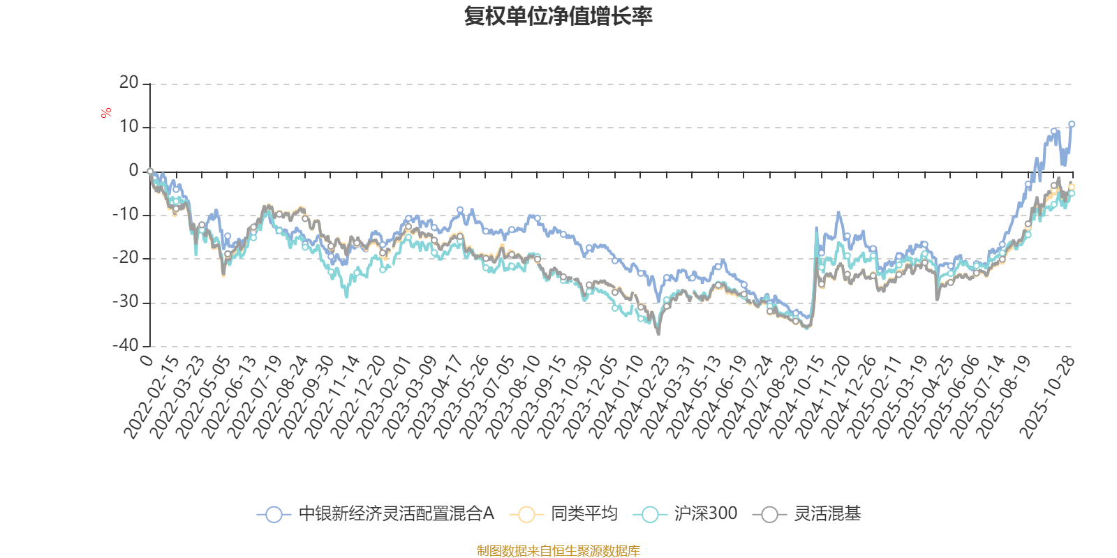 截至10月28日,中银新经济灵活配置混合A近三个月复权单位净值增长率为25.40%,位于同类可比基金243/1287;近半年复权单位净值增长率为43.08%,位于同类可比基金224/1287;近一年复权单位净值增长率为29.92%,位于同类可比基金430/1287;近三年复权单位净值增长率为40.92%,位于同类可比基金229/1286。
