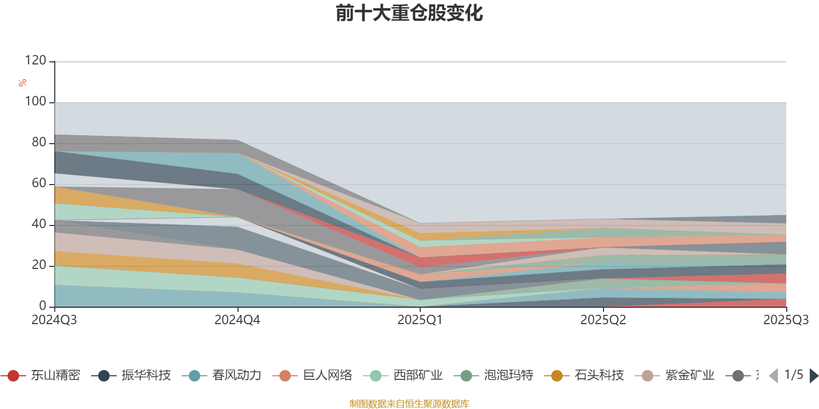 截至2025年三季度末,基金十大重仓股分别是寒武纪、欣旺达、中国黄金国际、中金黄金、菲利华、巨人网络、山东黄金、东山精密、英维克、春风动力。