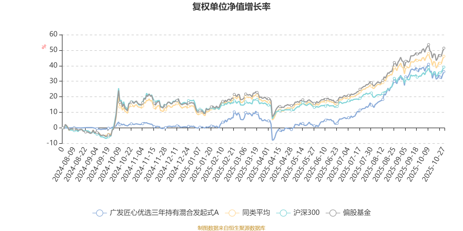 截至10月27日,广发匠心优选三年持有混合发起式A近三个月复权单位净值增长率为20.30%,位于同类可比基金211/689;近半年复权单位净值增长率为37.14%,位于同类可比基金204/688;近一年复权单位净值增长率为32.93%,位于同类可比基金234/653。