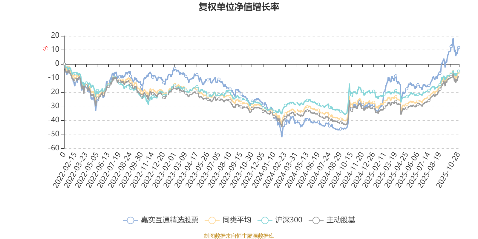 截至10月28日,嘉实互通精选股票近三个月复权单位净值增长率为23.09%,位于同类可比基金43/167;近半年复权单位净值增长率为35.73%,位于同类可比基金57/166;近一年复权单位净值增长率为57.29%,位于同类可比基金12/164;近三年复权单位净值增长率为22.72%,位于同类可比基金83/156。