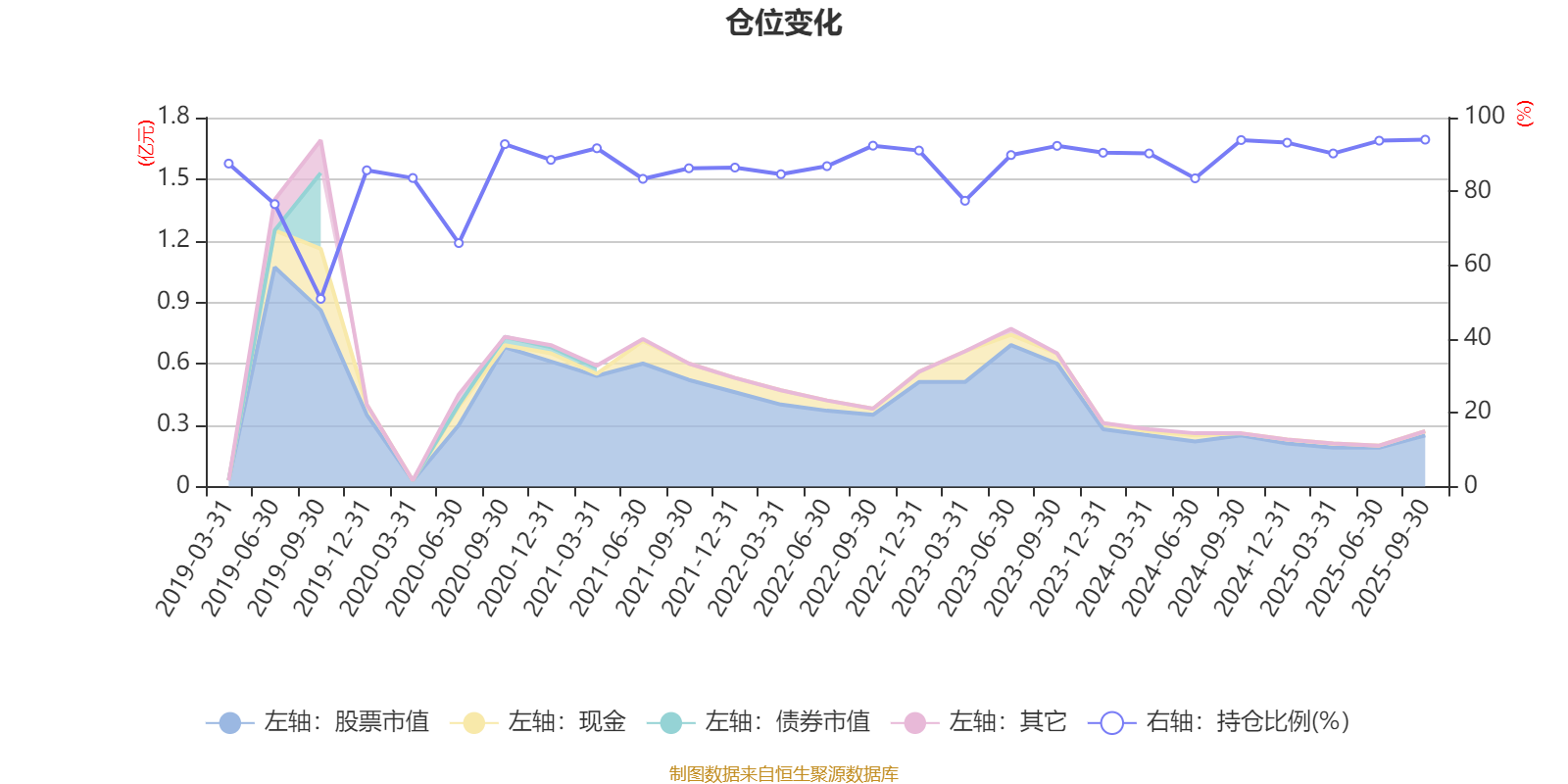 据定期报告数据统计,近三年平均股票仓位为90.01%,同类平均为72.35%。2025年三季度末基金达到94.02%的最高仓位,2019年三季度末最低,为50.88%。