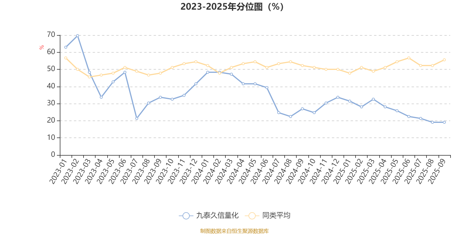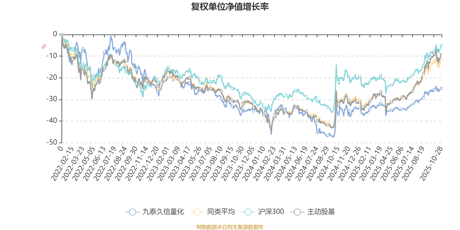 截至10月28日,九泰久信量化近三个月复权单位净值增长率为8.34%,位于同类可比基金82/121;近半年复权单位净值增长率为15.88%,位于同类可比基金91/121;近一年复权单位净值增长率为14.42%,位于同类可比基金83/115;近三年复权单位净值增长率为-4.13%,位于同类可比基金75/87。