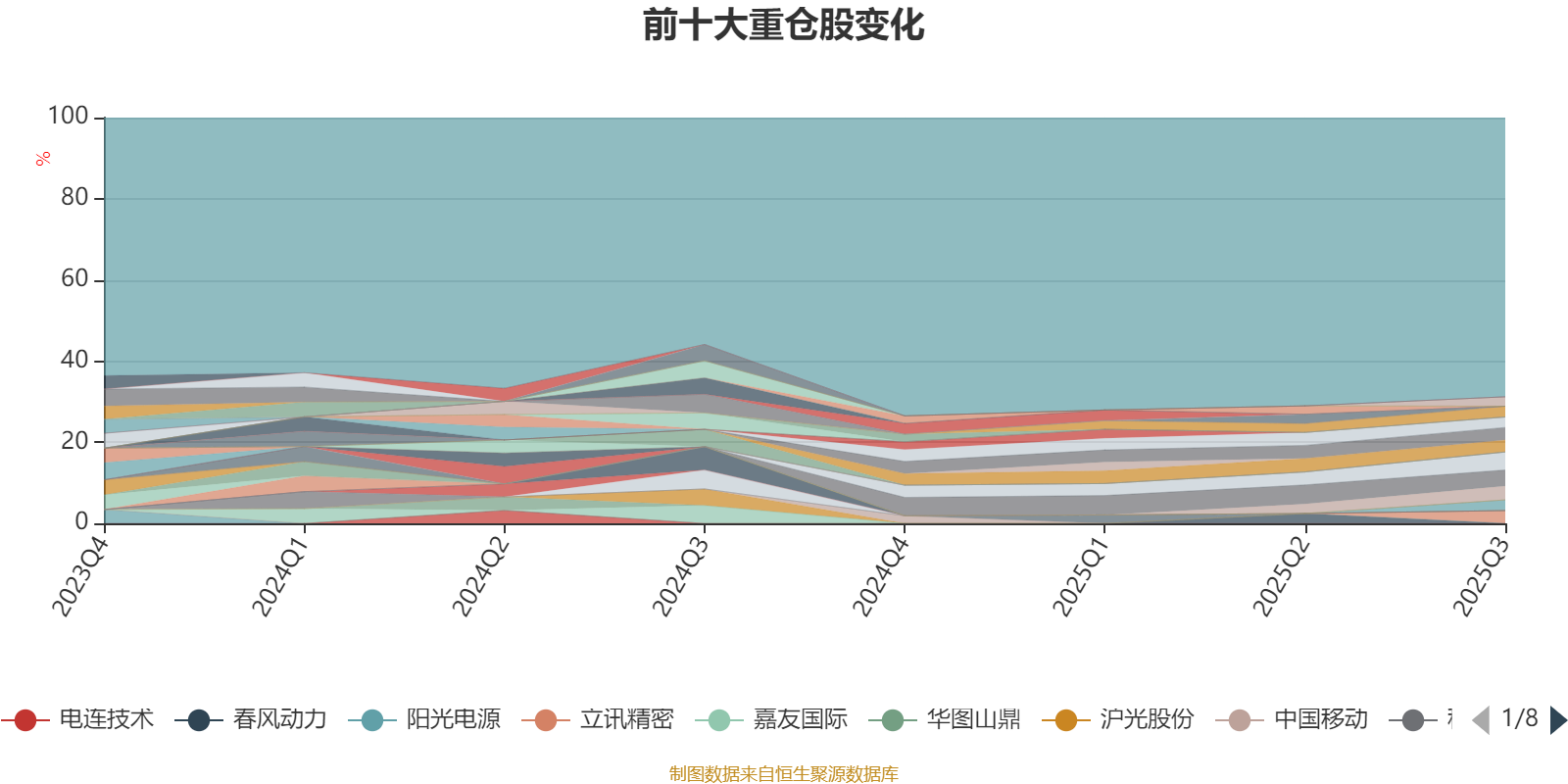 截至2025年三季度末,基金十大重仓股分别是宁德时代、贵州茅台、北方华创、立讯精密、工商银行、招商银行、汇川技术、紫金矿业、农业银行、三一重工。