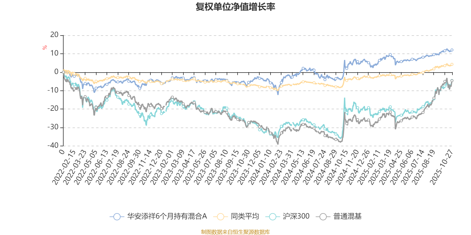截至10月27日,华安添祥6个月持有混合A近三个月复权单位净值增长率为2.57%,位于同类可比基金306/629;近半年复权单位净值增长率为5.95%,位于同类可比基金277/629;近一年复权单位净值增长率为5.99%,位于同类可比基金403/623;近三年复权单位净值增长率为19.37%,位于同类可比基金89/557。