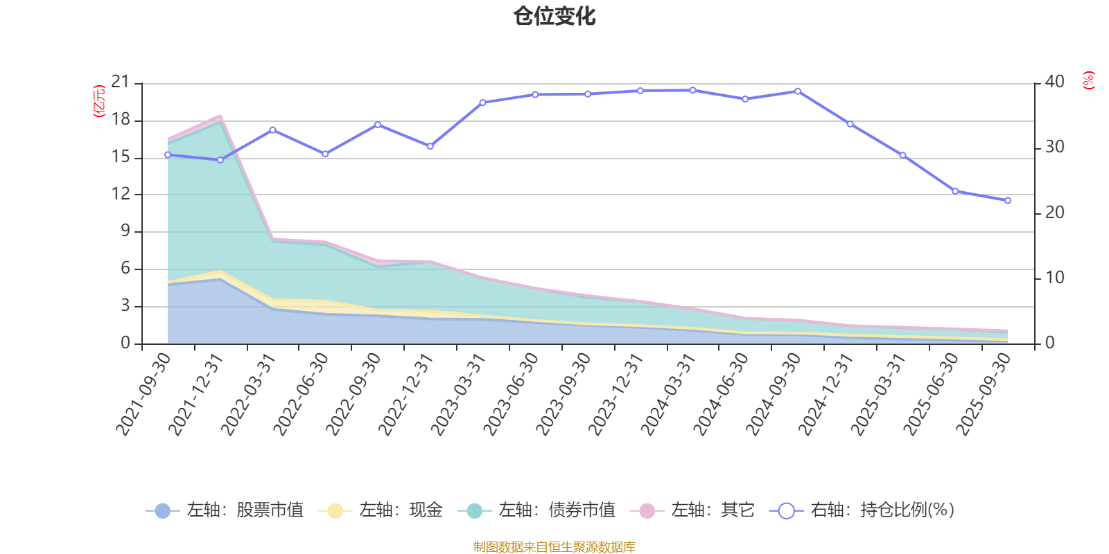 据定期报告数据统计,近三年平均股票仓位为33.84%,同类平均为19.14%。2024年一季度末基金达到38.91%的最高仓位,2025年三季度末最低,为21.99%。