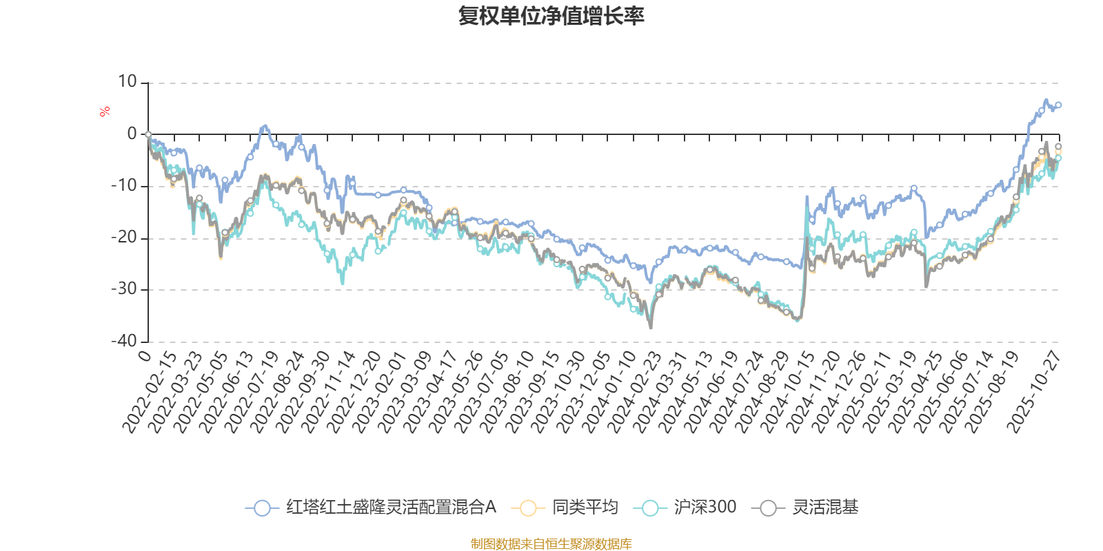 截至10月27日,红塔红土盛隆灵活配置混合A近三个月复权单位净值增长率为17.13%,位于同类可比基金468/1287;近半年复权单位净值增长率为28.01%,位于同类可比基金534/1287;近一年复权单位净值增长率为22.13%,位于同类可比基金648/1287;近三年复权单位净值增长率为20.51%,位于同类可比基金516/1286。