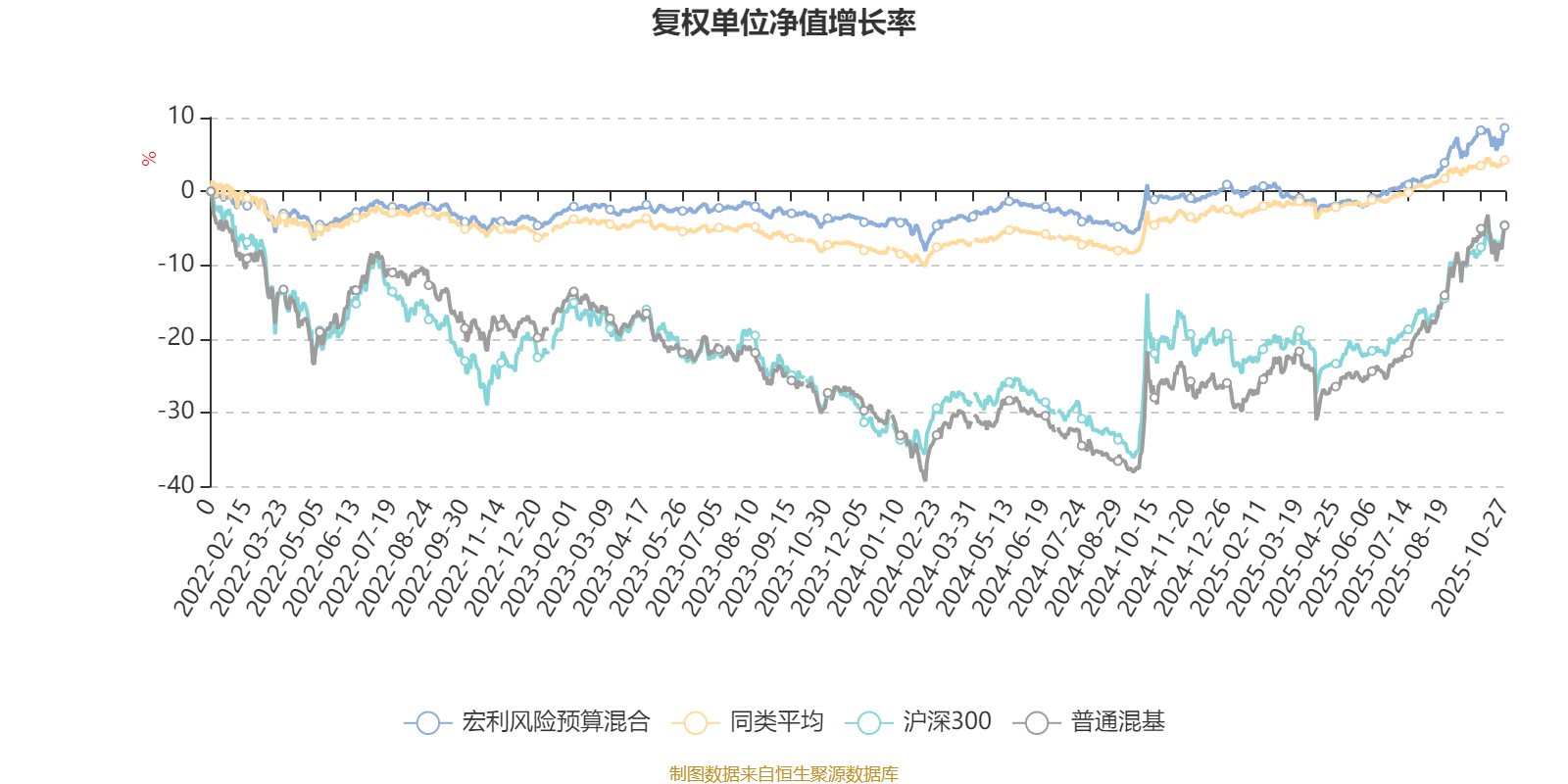 截至10月27日,宏利风险预算混合近三个月复权单位净值增长率为7.30%,位于同类可比基金50/629;近半年复权单位净值增长率为10.82%,位于同类可比基金77/629;近一年复权单位净值增长率为9.44%,位于同类可比基金176/623;近三年复权单位净值增长率为14.00%,位于同类可比基金195/557。