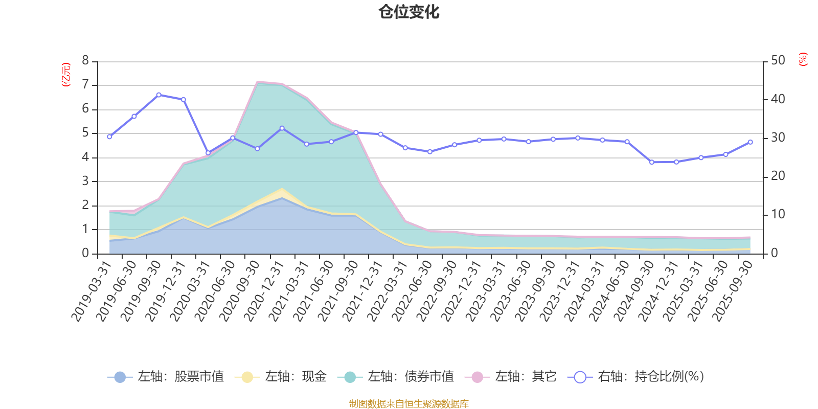 据定期报告数据统计,近三年平均股票仓位为27.88%,同类平均为19.14%。2019年三季度末基金达到41.29%的最高仓位,2024年三季度末最低,为23.81%。