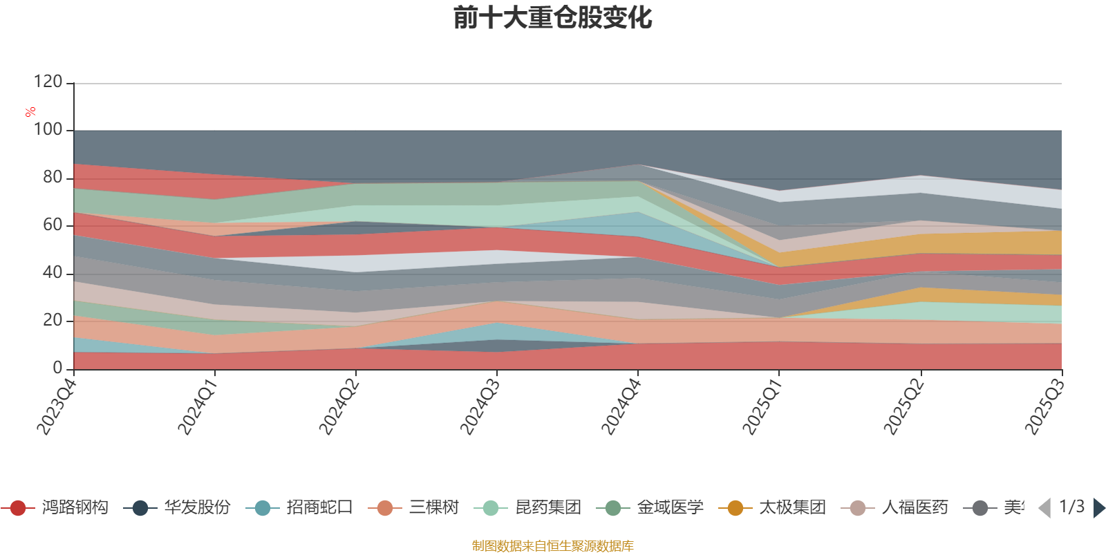 该基金持股集中度较高,近2年前十大重仓股集中度长期超过60%。截至2025年三季度末,基金十大重仓股分别是鸿路钢构、中矿资源、雅化集团、三棵树、华友钴业、昆药集团、科顺股份、东方雨虹、美年健康、太极集团。