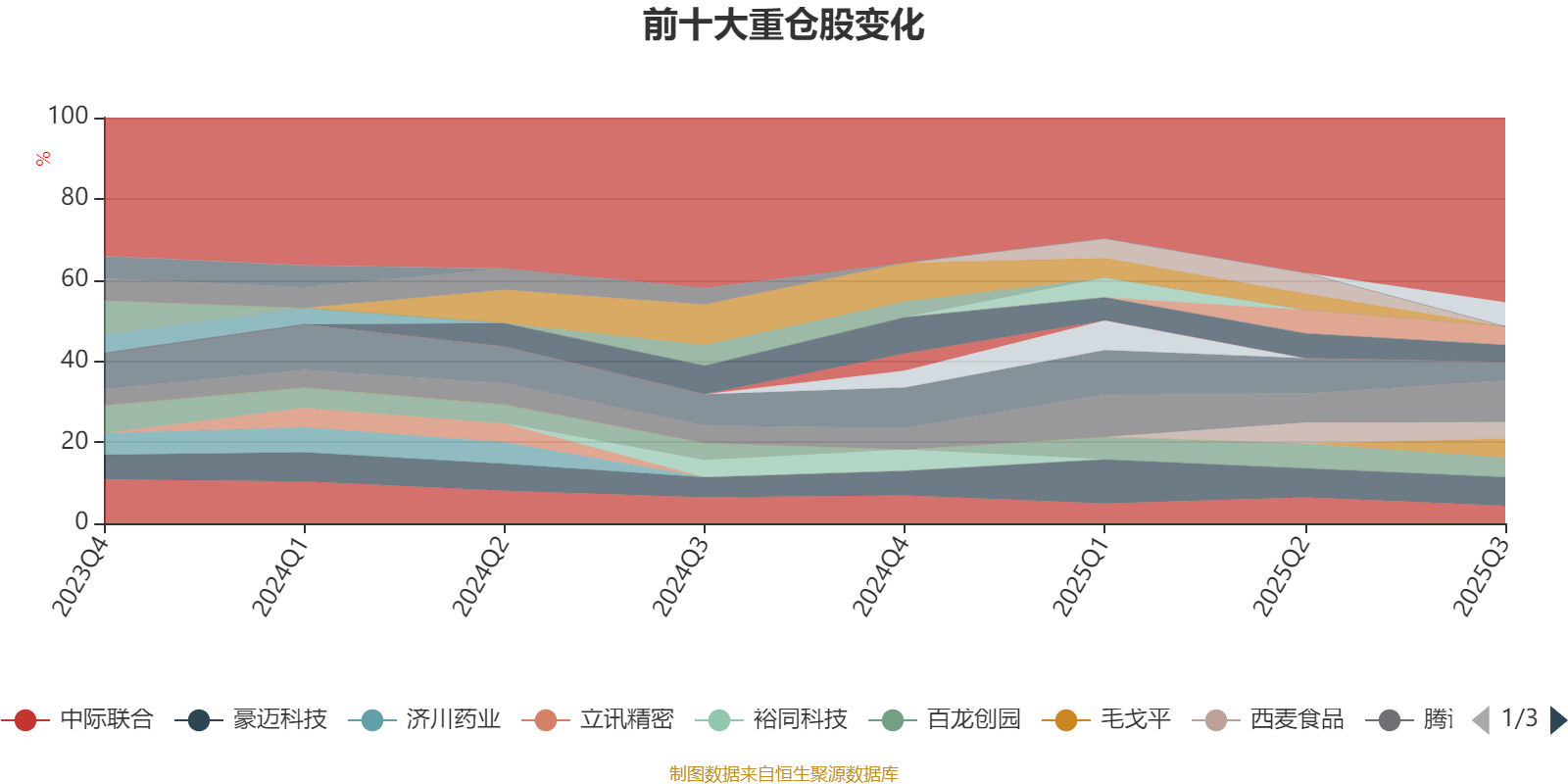 该基金持股集中度较高。截至2025年三季度末,基金十大重仓股分别是腾讯控股、豪迈科技、三环集团、百龙创园、毛戈平、理想汽车-W、宁德时代、中际联合、圣农发展、西麦食品。