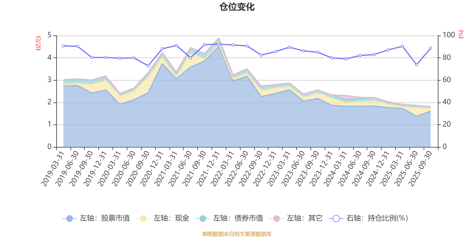 据定期报告数据统计,近三年平均股票仓位为84.21%,同类平均为85.66%。2021年末基金达到92.33%的最高仓位,2020年三季度末最低,为72.89%。