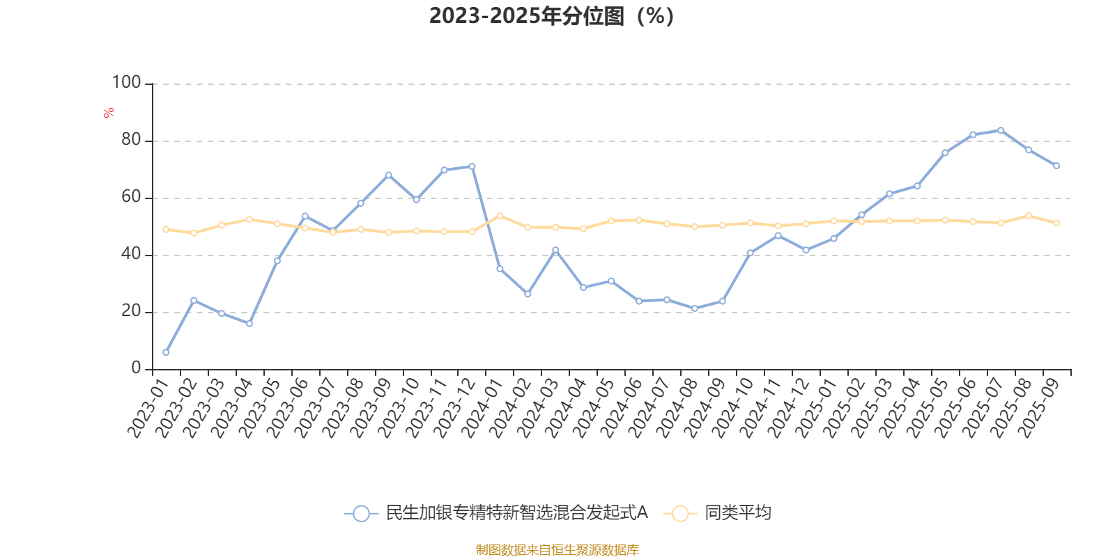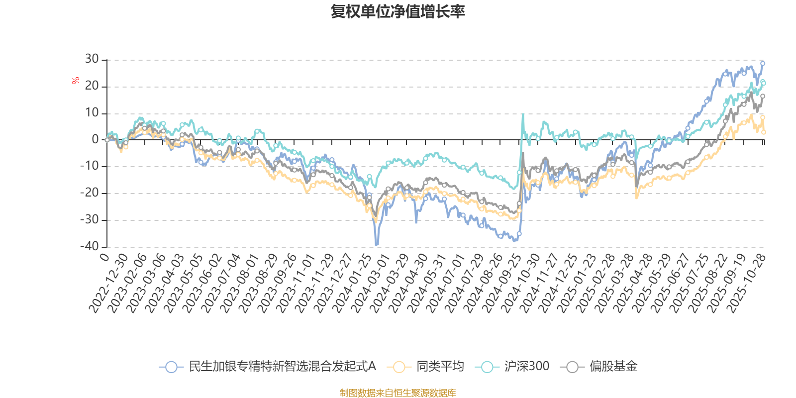 截至10月27日,民生加银专精特新智选混合发起式A近三个月复权单位净值增长率为12.35%,位于同类可比基金383/689;近半年复权单位净值增长率为40.15%,位于同类可比基金163/688;近一年复权单位净值增长率为53.72%,位于同类可比基金68/653。